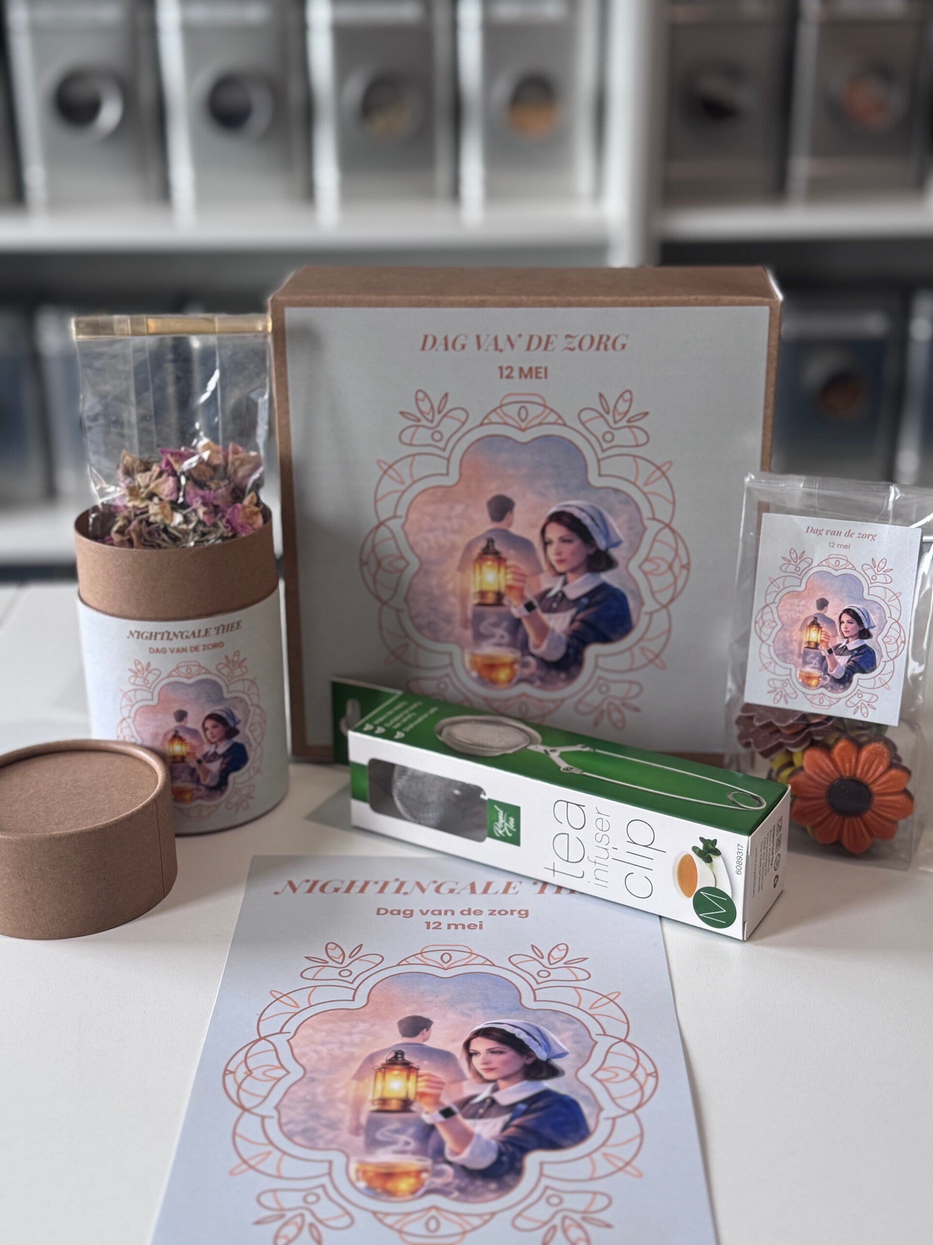 Een flyer met het verhaal van de theeblend, een ode aan Florence Nightingale en een boodschap van waardering voor de Dag van de Zorg.